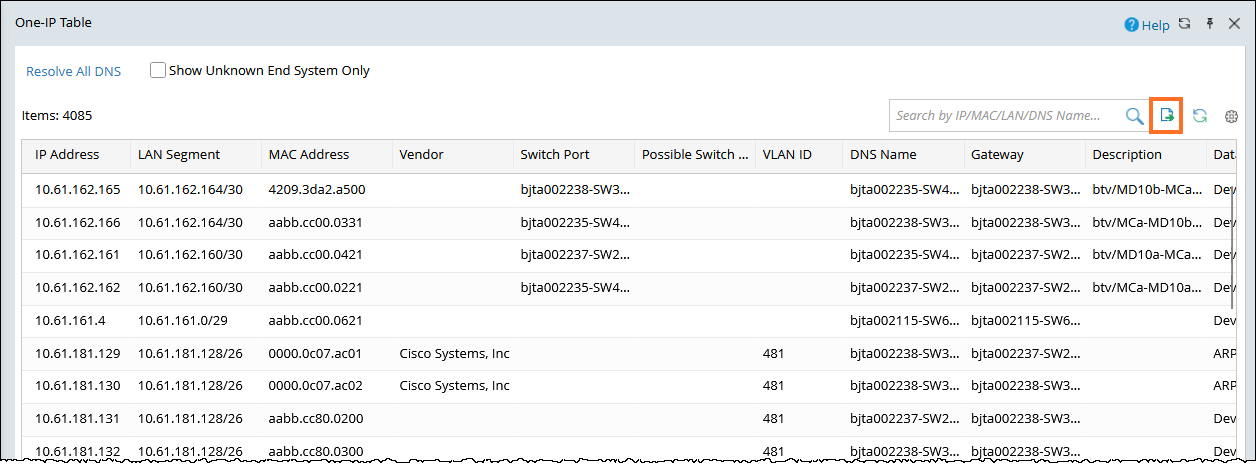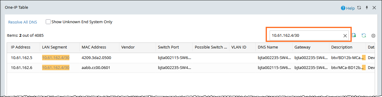 You can search the One-IP table by entering a keyword in the search bar, which can be IP Address/LAN Segment/MAC Address/DNS Name/VLAN Group/VLAN ID/Device Name/Interface Name. All columns of the One-IP table are in the search scope, except for Data Source, Possible Switch Port, Gateway and Data Retrieve.