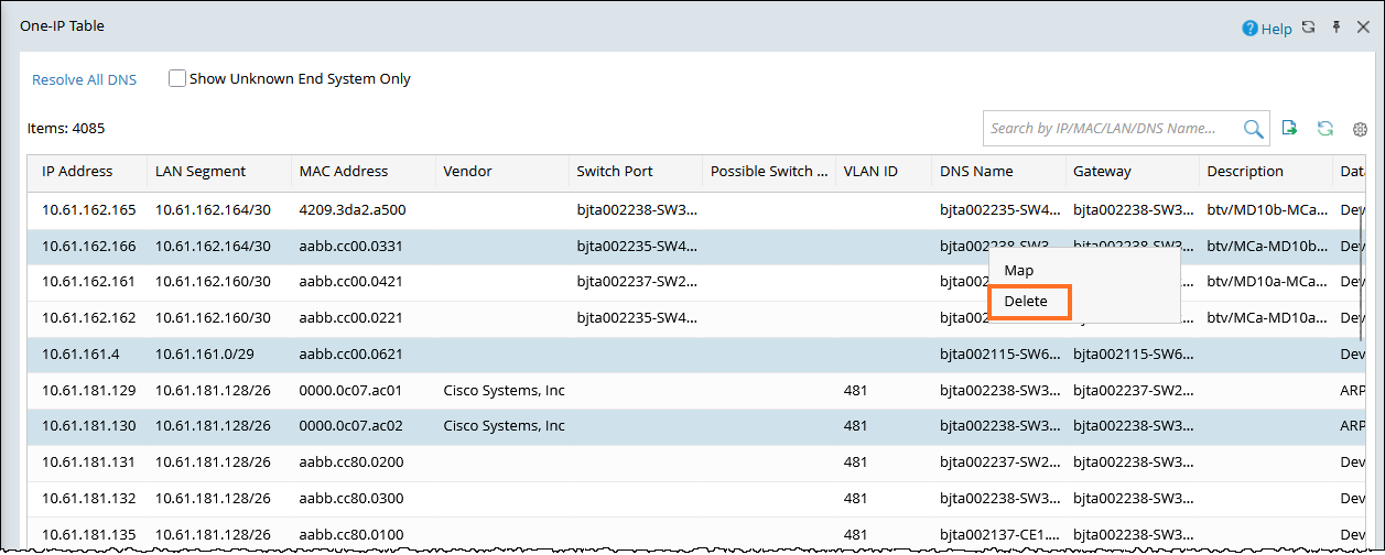 On the One-IP Table page, you can remove entries. Select and right-click the entry to be removed, and then click Delete from the menu. You can select multiple entries and remove all of them.