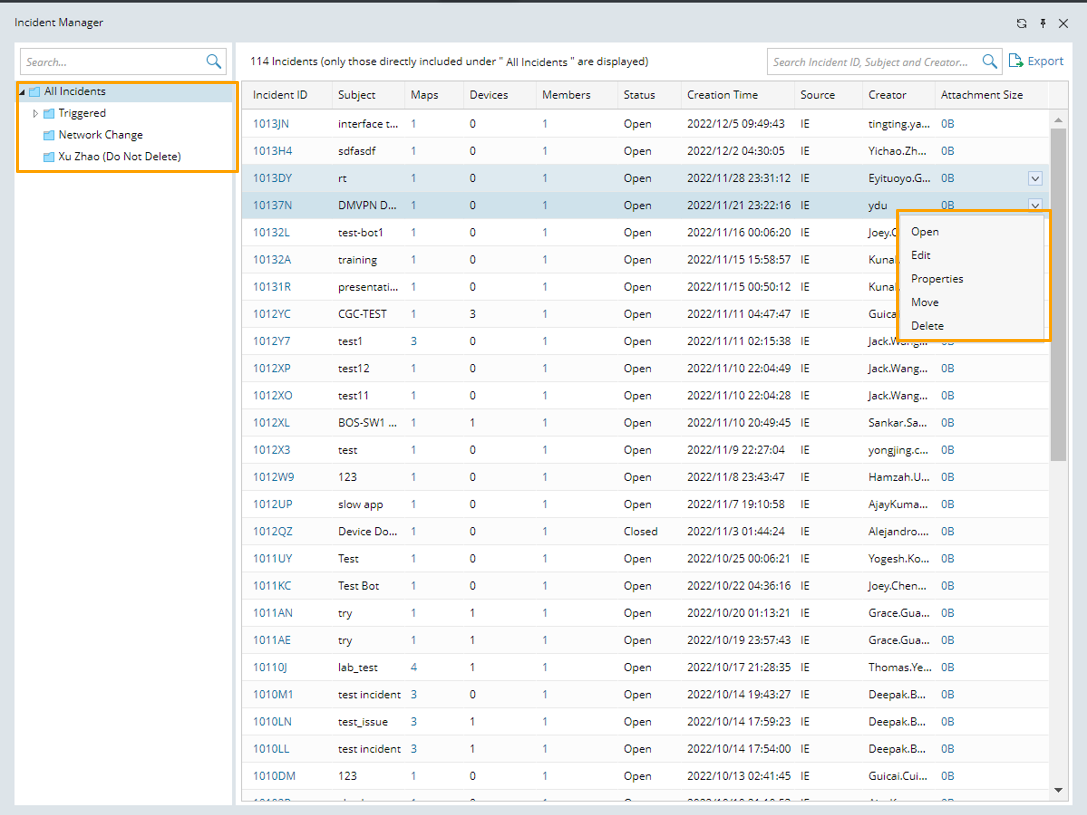 Note: The export function in the folder structure can be used to export the incident list under the current folder and its subfolders, but the export function at the upper-right corner of the incident table can only export the incident list in the current table.