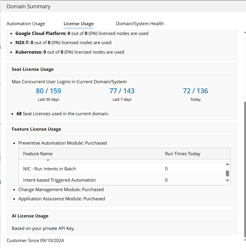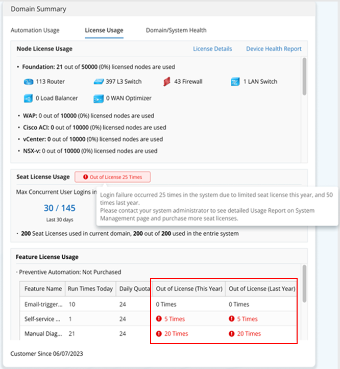 Note: The "Customer Since" date is displayed at the bottom of the License Usage tab. The license usage data is collected from this day.