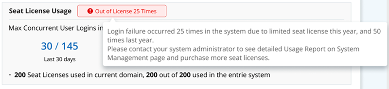 - If the license is used out of the license node limit, in the Seat license Usage section, the number of times of out of license for this year is displayed. you can view more information from the tip message, including the times of out of license for the last year.