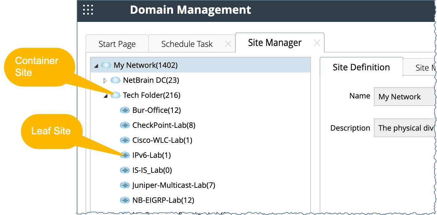 ) — A parent site that contains leaf sites and other container sites. No devices are directly nested under a container site.