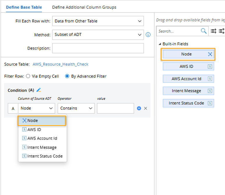 Note: If node is selected as available filed in the source table, node column can be used to define the filter condition to filter row.