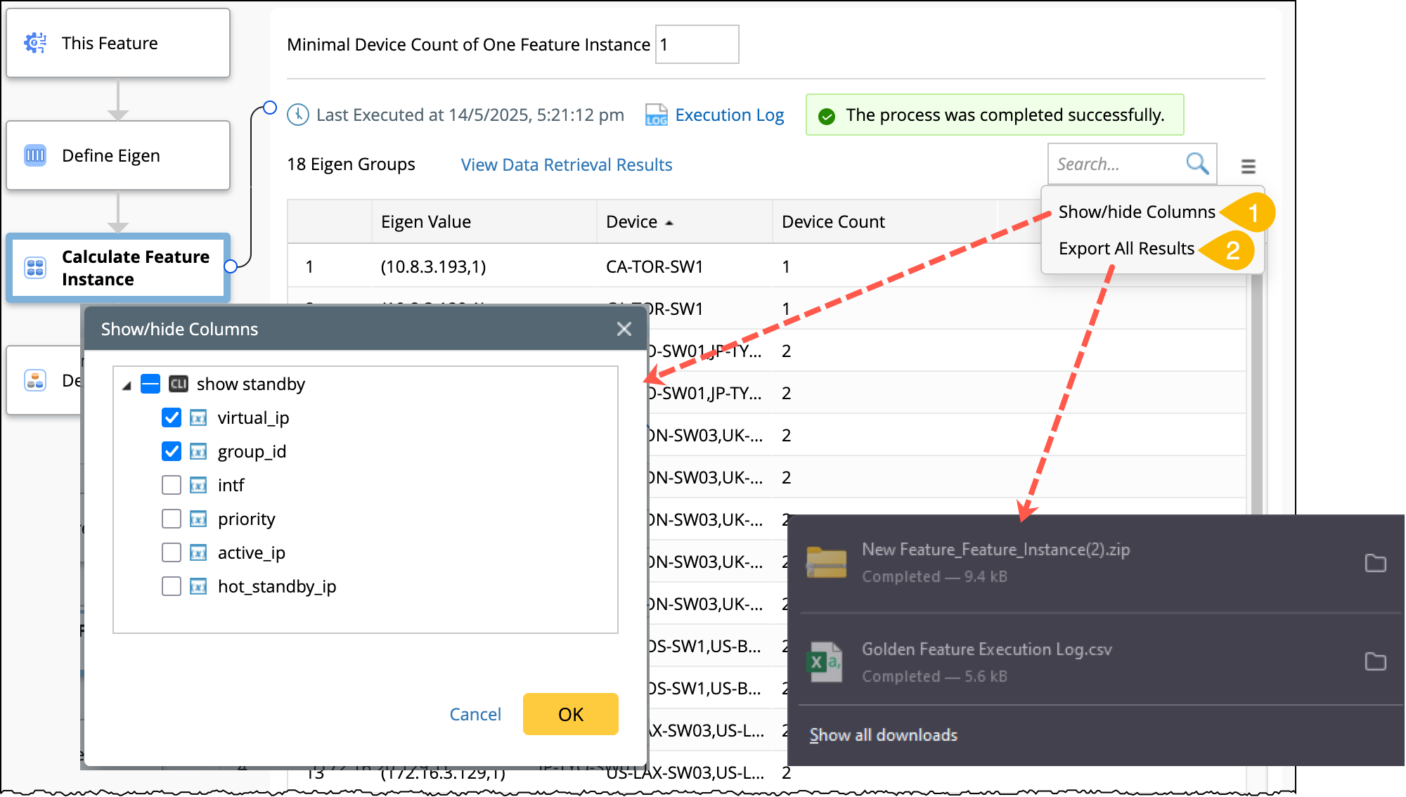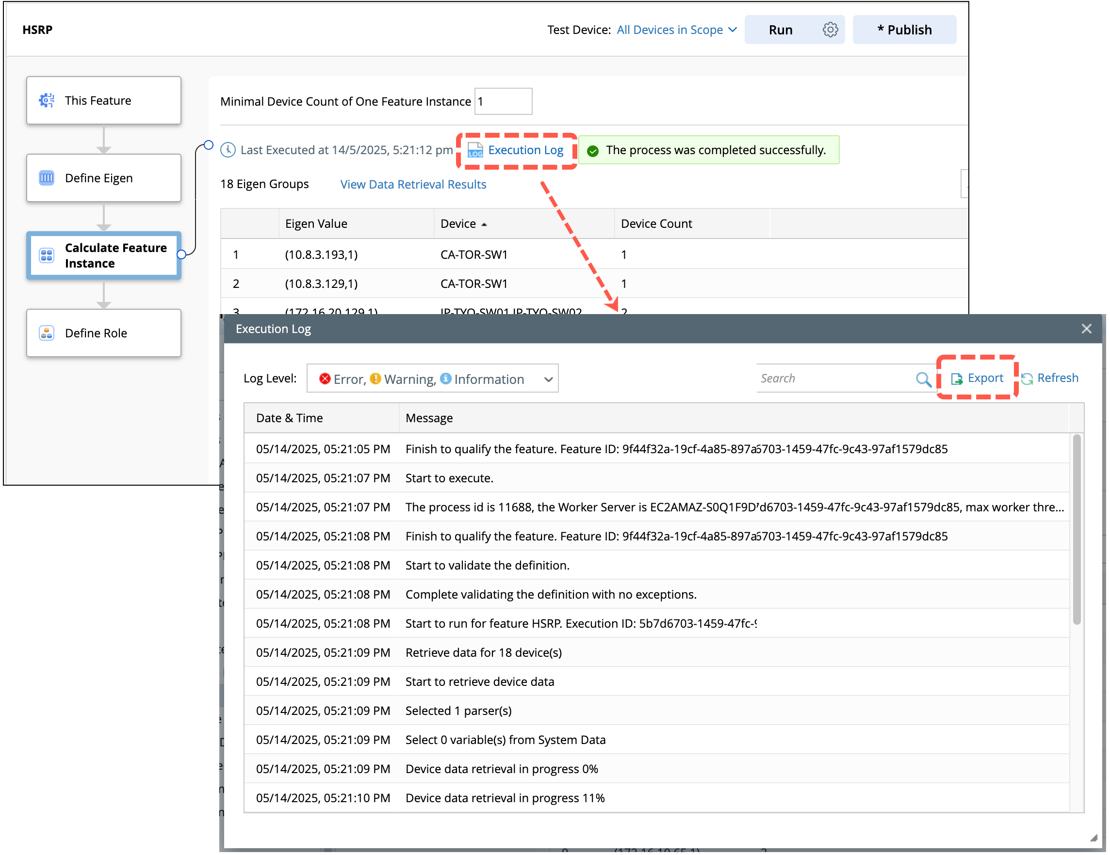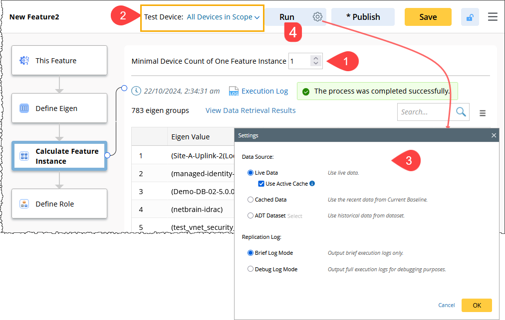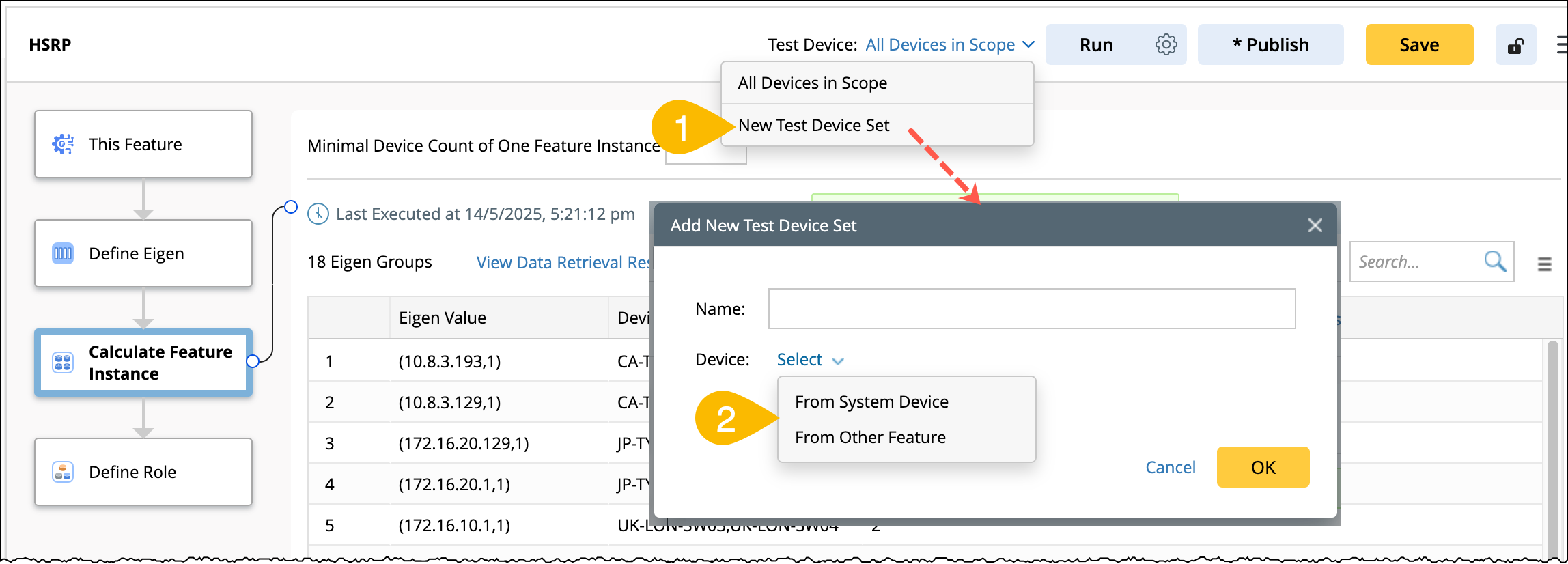 The primary function of this node is to select a subset of Test Devices for computing and debugging the Feature Instance. This process is based on the Eigen settings configured in earlier steps. By choosing specific Test Devices, users can focus on testing and refining the Feature Instance, ensuring it operates correctly before applying it more broadly across the network. The system will calculate Feature Instances by: