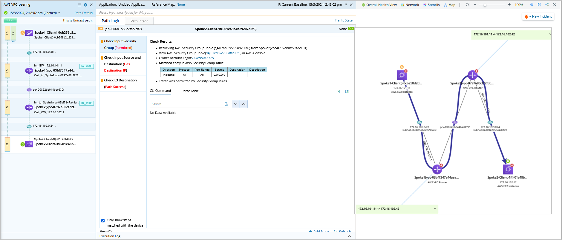 An AWS VPC consists of an IP range and subnets, and it may also contain cloud-native networking services such as NAT gateway, IGW, VGW, and so on. The system can create an AWS VPC router for each VPC to simulate the routing and security check function for this VPC. The subnet is visualized in the system's dynamic map via the concept called LAN media. From the dynamic map, you can view different networking objects and how they are connected. The system can also support VPC peering and visualize the corresponding peering ID on the dynamic map.