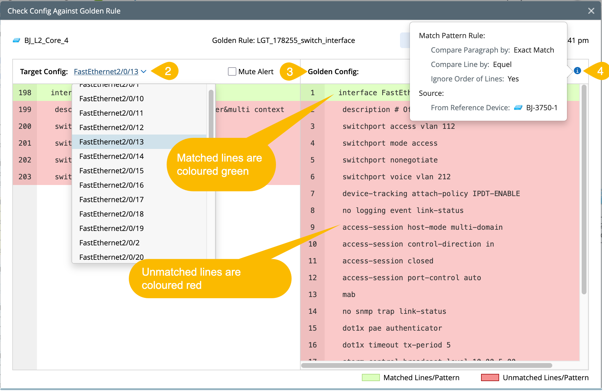 icon in the Golden Config pane. A tip message will appear with match pattern rule settings and the reference device used to define this Golden Config Template. It helps you understand the match results.