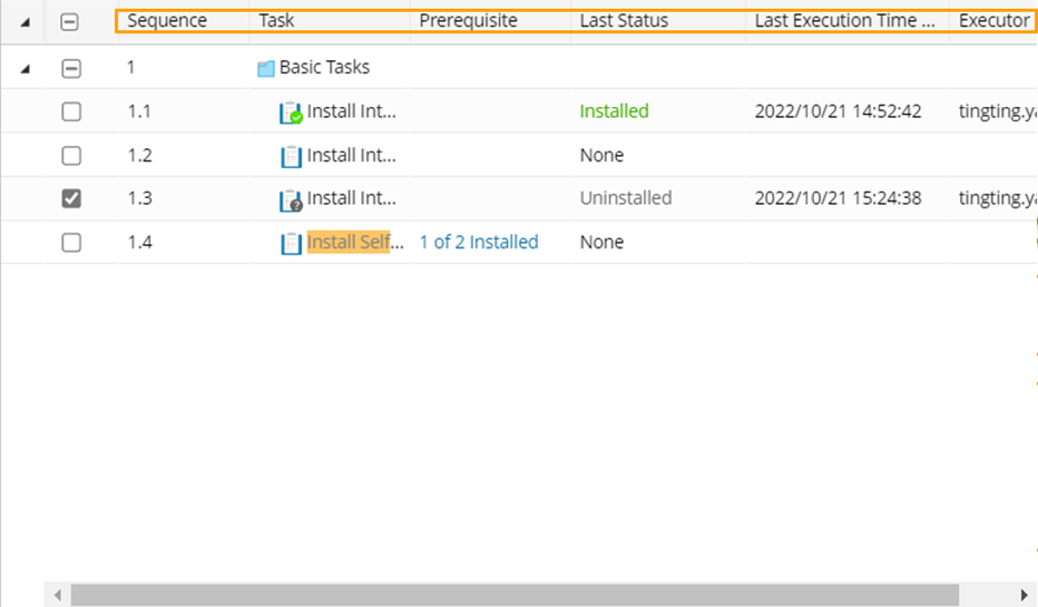- Last Status: The status of the last execution of the task, which can be Installed, Uninstalled, Installed with error, Installing…, Waiting to be installed, None.