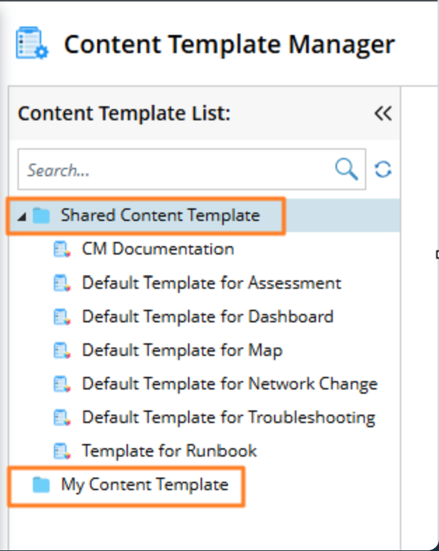 Content Template Manager is provided to pre-define and manage multiple templates. You can access it from the menu > Map-Based Automation > Runbook &Template> Content Template Manager and has the following privileges to manage each folder: