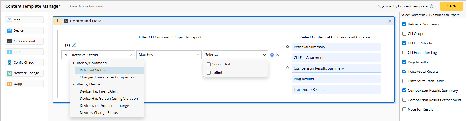 Command: You can execute multiple commands to retrieve data and filter the commands to be exported by command and device. And from the right pane, select the command content such as retrieval summary and execution log.