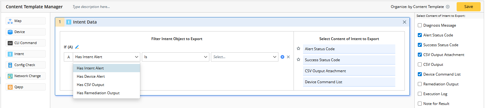 - Filter the devices using conditional statements, eg: Device Has Intent Alert | Is | False, this condition will retain the devices without intent alerts.