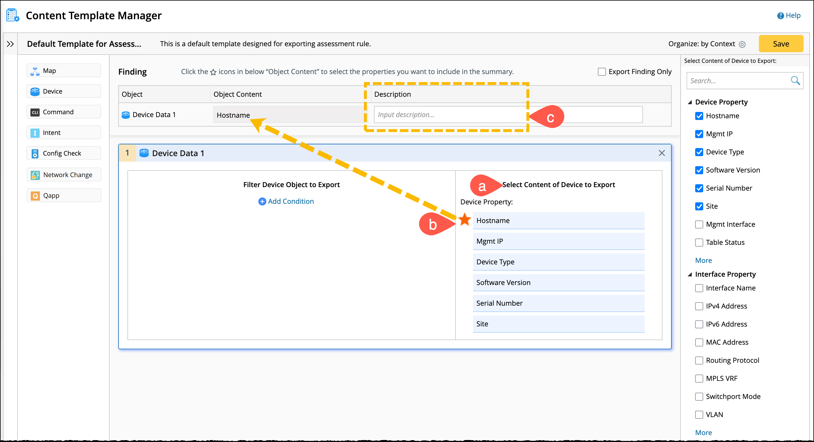 The template editor allows you to populate the content area with objects and findings. And define conditions to filter entries within the selected objects, followed with selection of properties for exporting the content.
