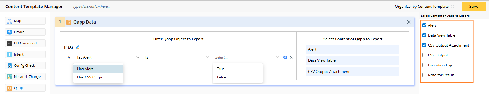 - Qapp Data: Filter which Qapp objects to export based on specific conditions, such as Has Alert or Has CSV Output.