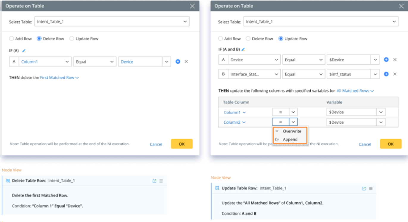 The ADT column needs to be used as a match condition for the ‘Delete Row’ and ‘Update Row’ actions. The operators in condition are unified as follows: