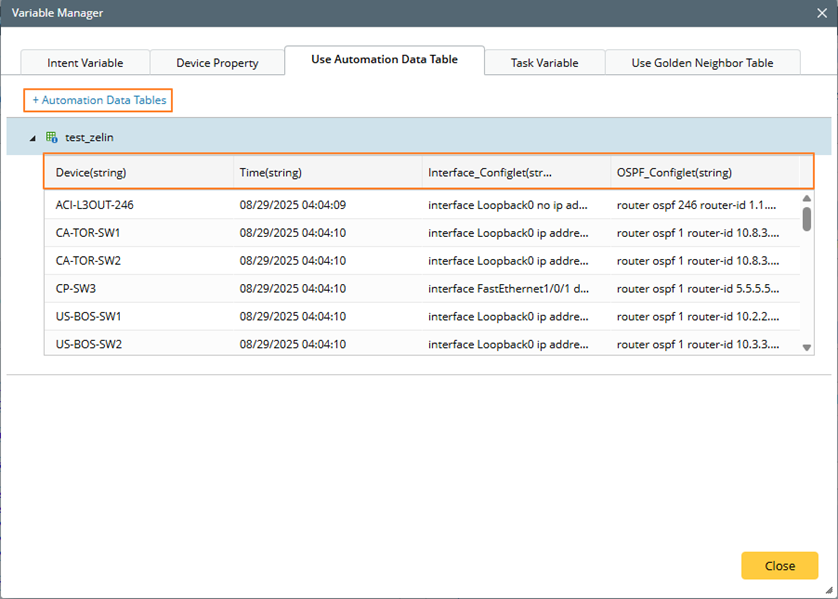 - If the referenced columns are in the type of object, device list, or interface list, their data type will be displayed as string. You need to loop the ADT first, and then use the ‘set variable’ to store the data in the local variable with the corresponding type before it can be used.