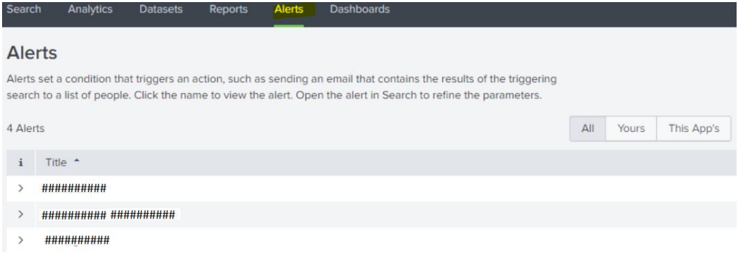 Note: For more about alert creation in Splunk, navigate to Steps to Create an Alert in Splunk. - You can find the existing alerts in the Alerts tab.