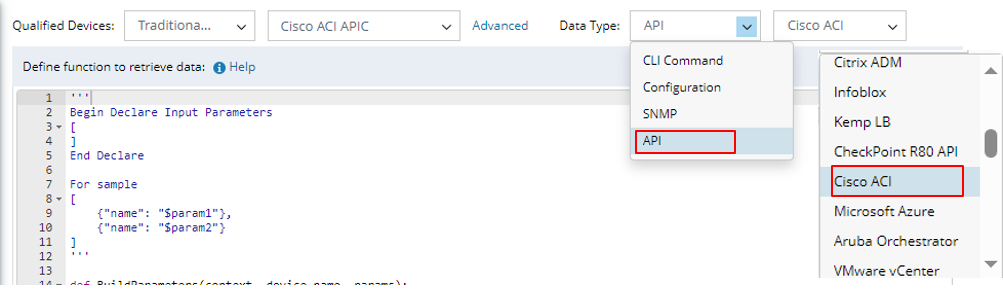 | 3 | def RetrieveData(devices) | This function is used to retrieve the data of devices based on the parameters declared in the Declare Parameters and BuildParameters functions. This function contains one parameter. The following is a sample code of this function: