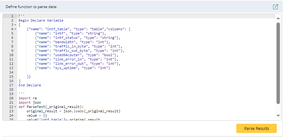 | 1 | Declare variable tree | This function declares the metrics (variables) and the types you want to parse from the retrieved device data and generates a variable tree. The following parameters of a variable are defined: