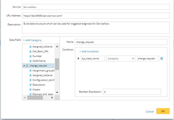 Each category corresponds to the different types of API calls from this ticket system, which usually has various data fields or parameters. For example, one category for the Incident ticket and another for the Change Request ticket.- Change the name.