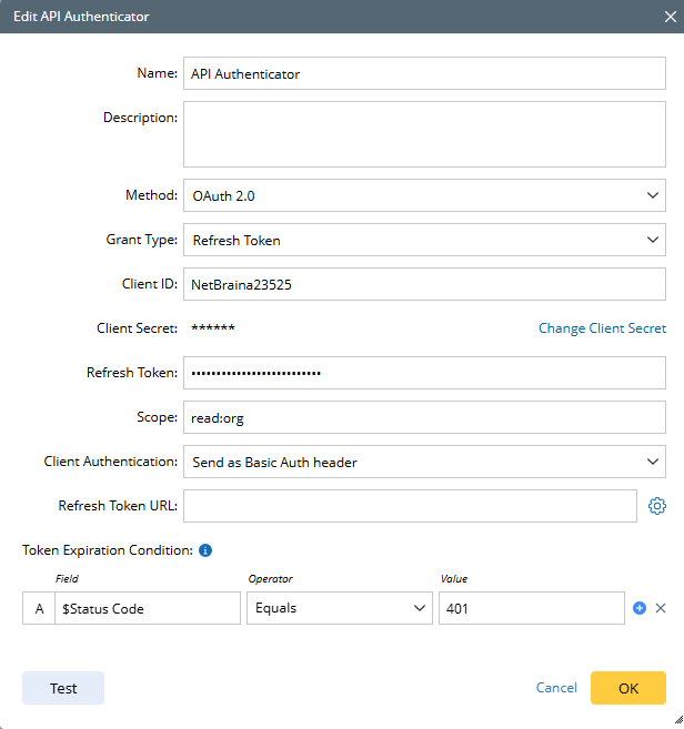 | 6 | OAuth 2.0 (“Refresh Token” grant type) | If OAuth 2.0 is the Authenticator method, “Refresh Token” is a supported Grant type. The following settings are made to configure API Authenticator with this Grant type: Name/Description: Define these basic information. Client ID: A public identifier assigned to the application when it is registered with the OAuth authorization server.Client Secret: A confidential value known only to the application and the authorization server, used to prove the client’s identity.Refresh Token: Specify a refresh token for authentication. The refresh token is used to renew an expired access token while preserving the user’s session.Scope: Scope determines the permissions of the refreshed access token and can only stay the same or be reduced from the original authorization. The scope of the access request, which may have multiple space-delimited values.Client Authorization: Select a way to send authentication credentials (Send as Basic Auth Header/ Send client credentials in body).Refresh Token URL: Uses this endpoint to exchange the refresh token for an access token. If empty, it will use the access token URL instead.Token Expiration Condition: Define the conditions for determining token expiration. Status code, body, header are used to define the filter condition. |  |
