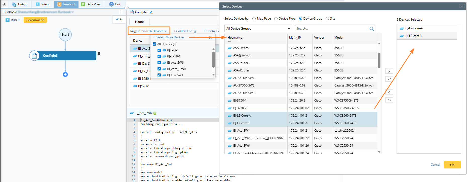 The selected devices are added to the Device column in the Configlet node table.