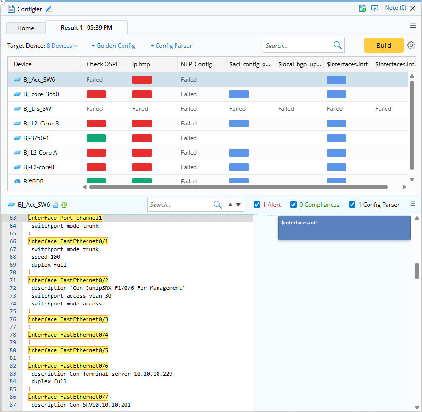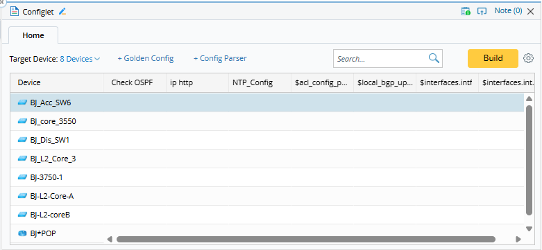 - Build the Configlet: Click Build to get configlets for each target device using the config files from the current baseline. As the build progresses, color blocks will gradually appear in the table indicating the status of configlets.