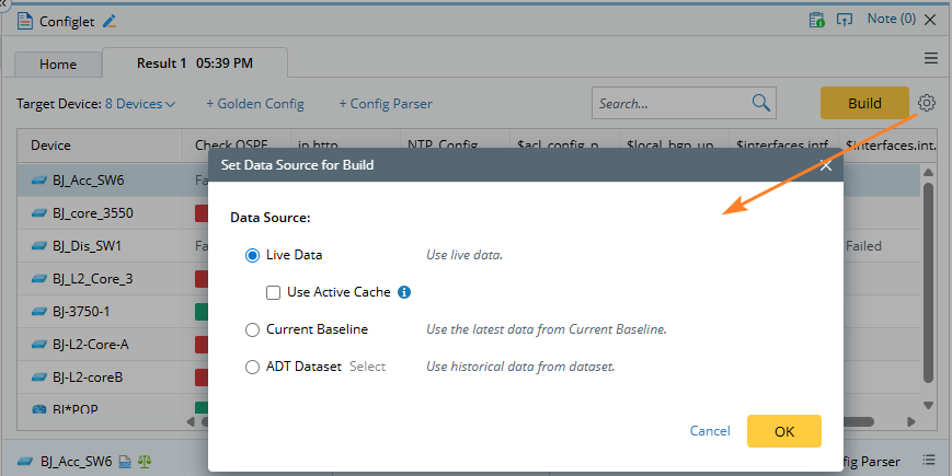 The data source used for building configlet is configurable. The default data source is Live Data.