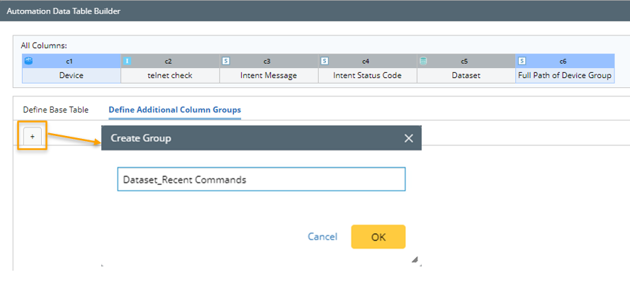 - Go to Automation Data Table Builder, create a Base table, then create a new group and name it (for example, "Dataset_Recent Commands").
