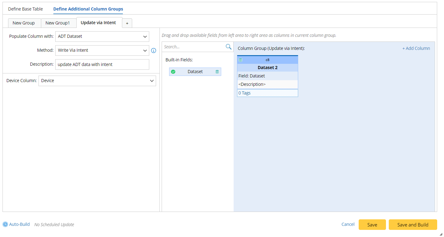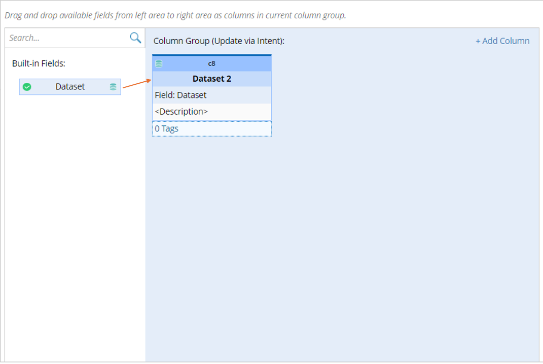 - Mapping available fields to Column Group: Drag and drop the available fields to the column group definition. When the dataset column is built via ADT Dataset method, the built-in field is Dataset.