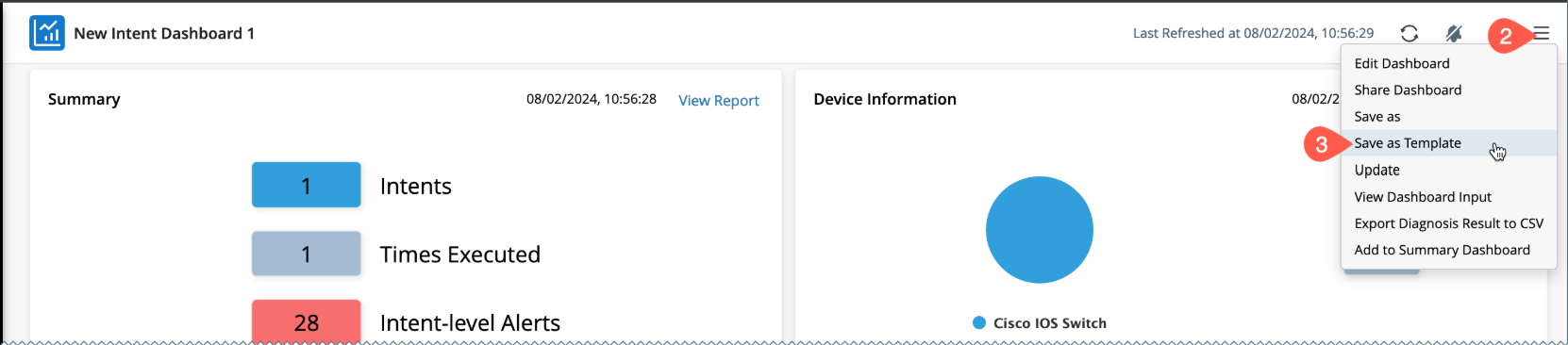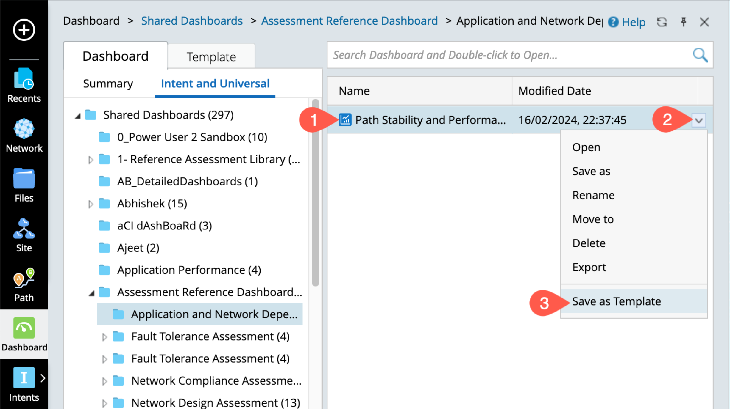 A dashboard template can be created to reuse some dashboards. Users can choose a template to assist them in completing most of the configuration when manually creating an intent dashboard. An Intent Dashboard template will be created from Dashboard Manager or created from an Intent Dashboard as follows: