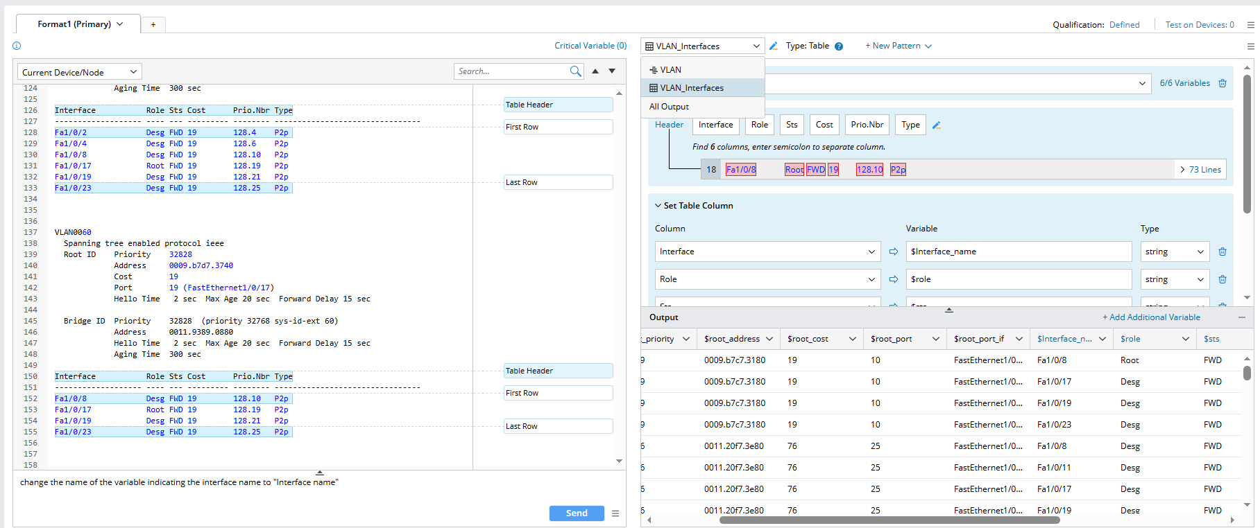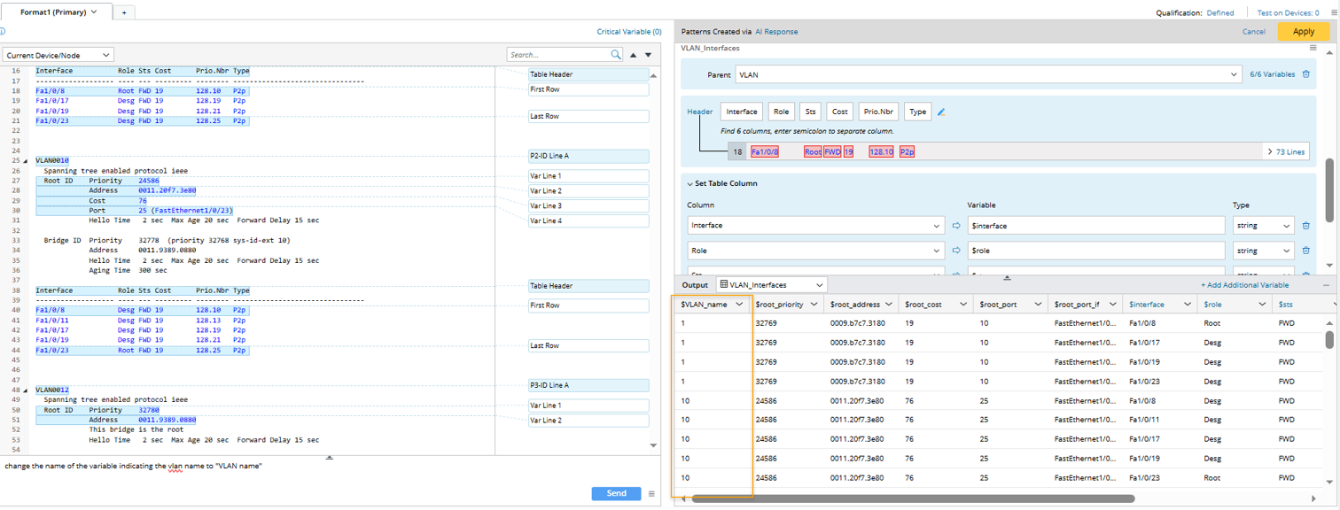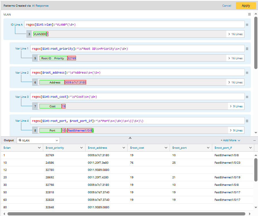 - In the Prompt Input Pane, input the prompt "Please parse the priority, address, cost and port of root, also extract the interface information of each vlan", then click the Send button. AI creates a paragraph pattern "vLAN" to get the metrics of ID root and a table pattern "VLAN_interfaces" to parser interface metrics.
