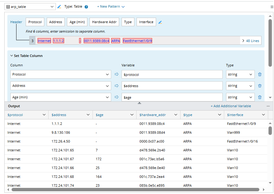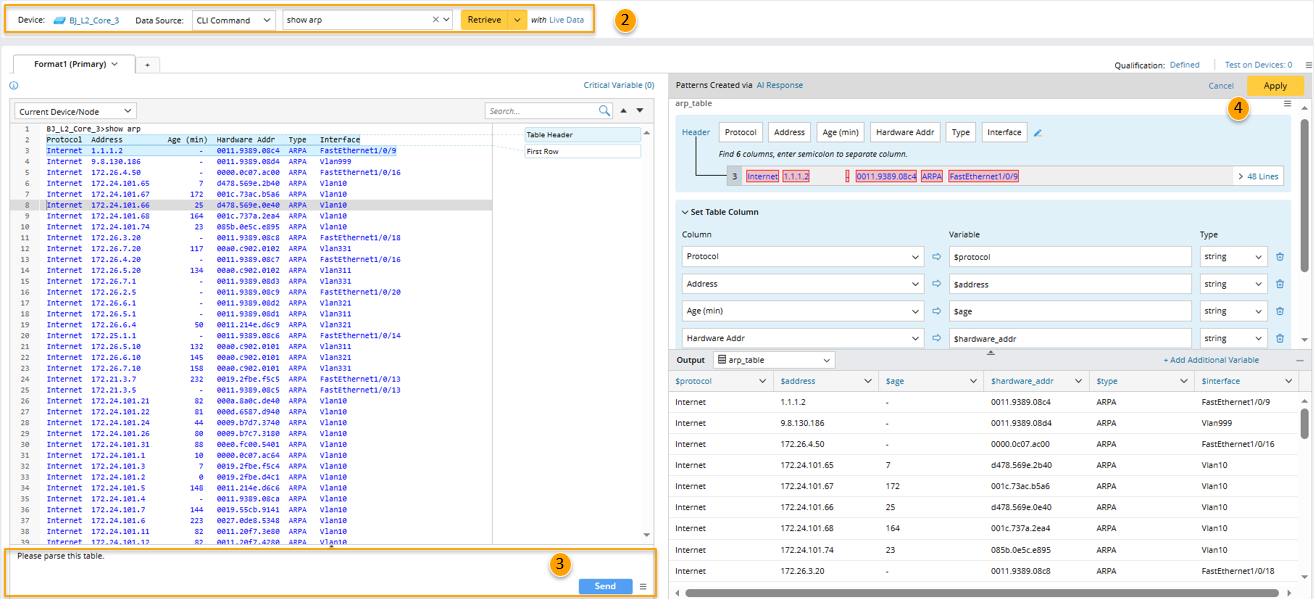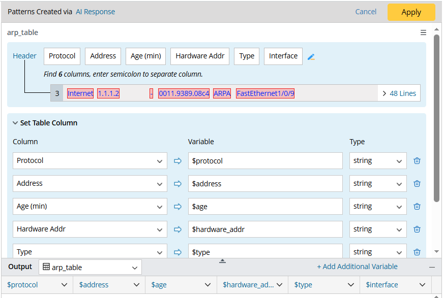 - In the Prompt Input Pane, input the prompt "Please parse this table.", then click the Send button. a table pattern "arp_table" is created by AI. You can manually change the column headers for define more advanced settings or give more prompts to AI to ask AI do this.