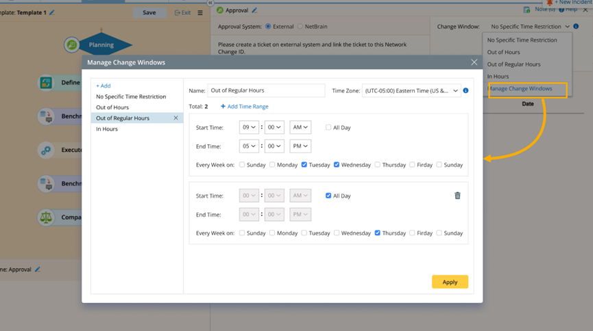 (Optional) Define a change window in the Planning node. The change window can be a reference for others who use this template, showing the appropriate time for the execution of the change.