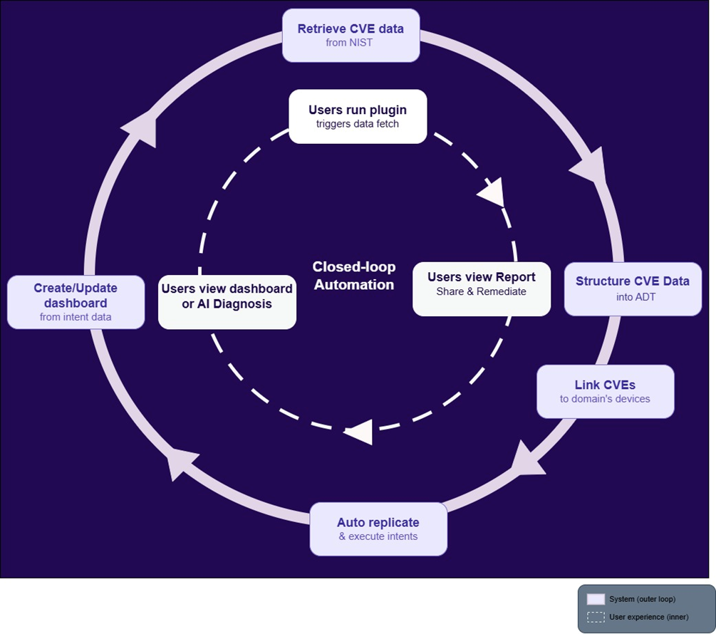 - Creates dashboards/reports so users can quickly see exposure. The CVE automation resources include network intents, automation data tables, and dashboards.