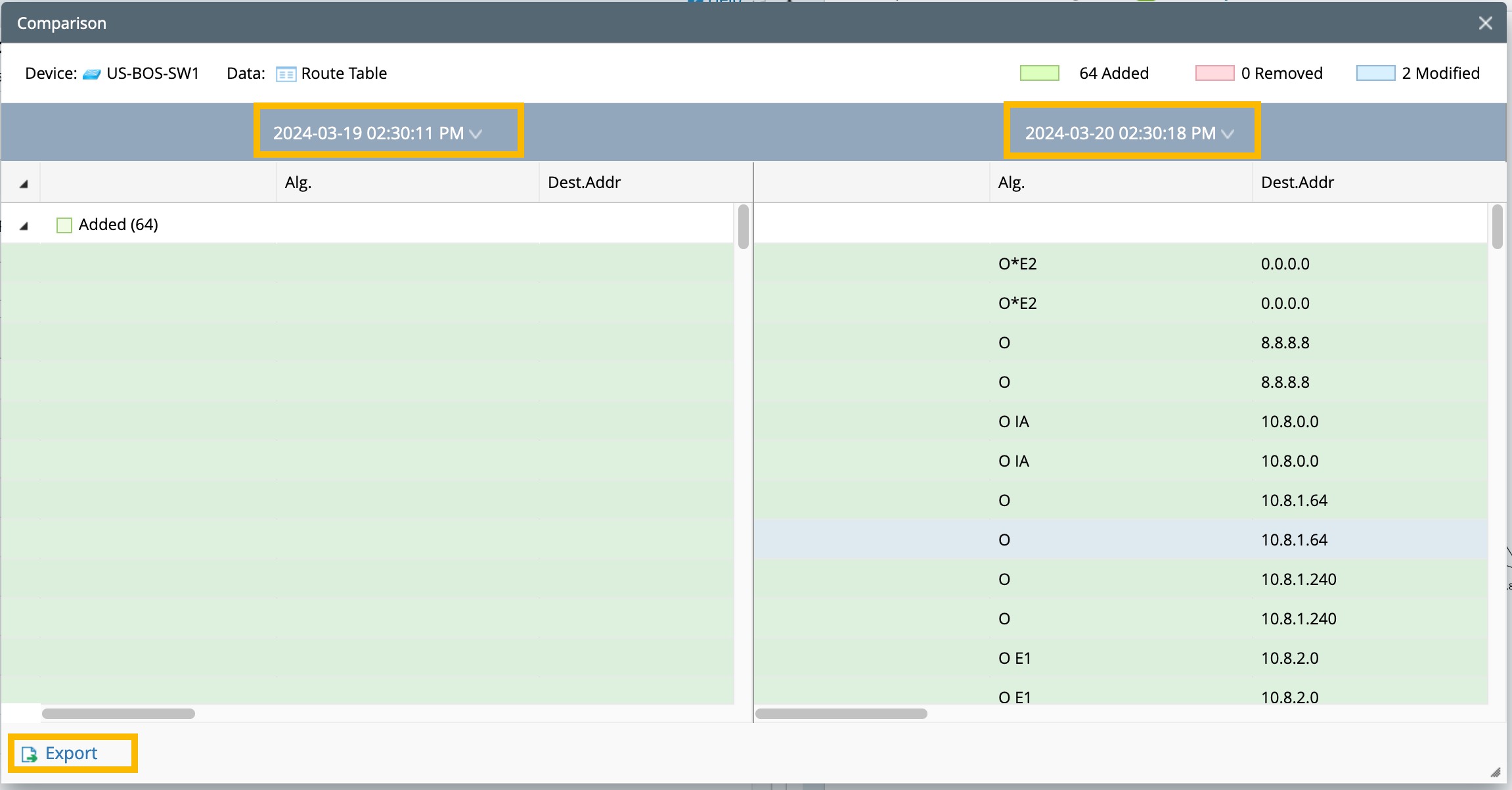 - You can select data tables from different times to compare. Exporting the comparison result is also available.
