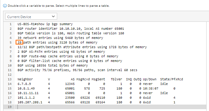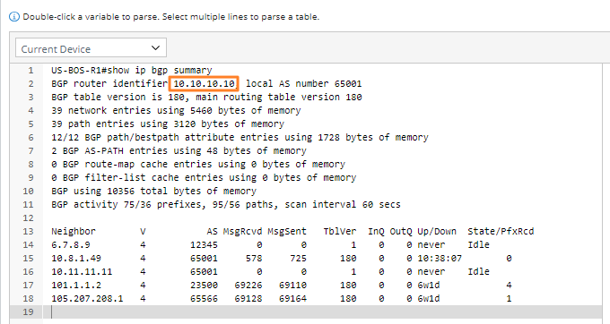 Take the BGP router as an example. If you want to parse its IP address, you can skip the string local AS if it is not relevant.