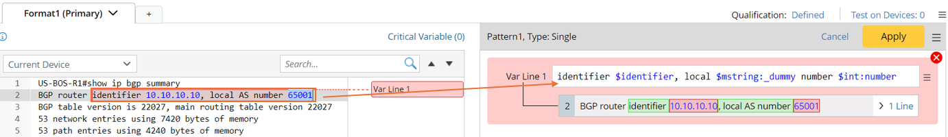 For example, in the sample data below, if 10.10.10.10 and 65001 in the same line are selected as variables, the line pattern “identifier $identifier1, local $mstring:_dummy number $int:number” will be generated.