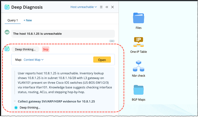 The diagnosis reasoning process will be initiated, the reasoning process will show how the AI finds the root cause. You can Skip the diagnosis at any time.