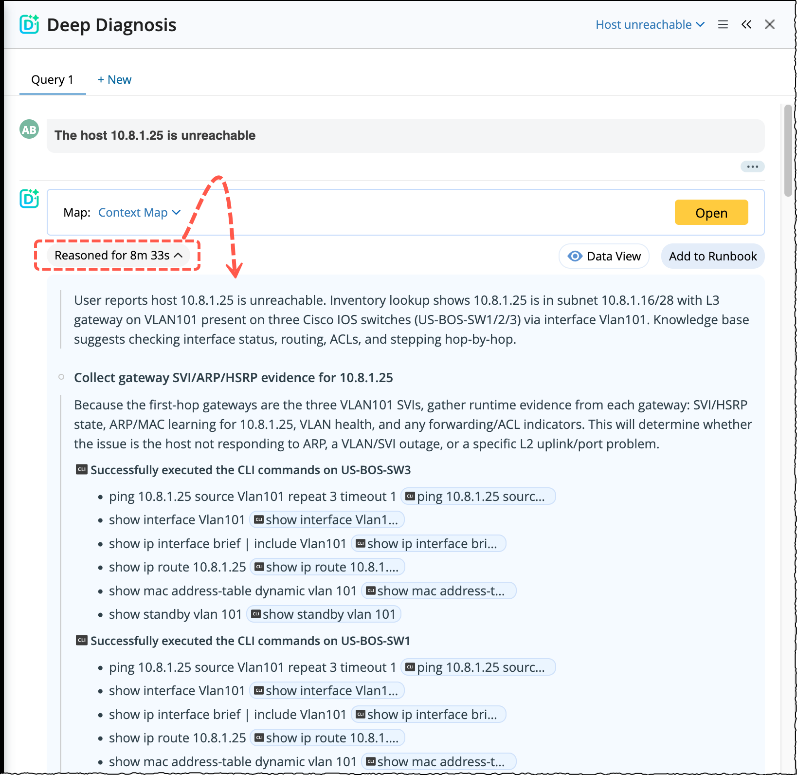 - Input the the network problem (The host 10.8.1.25 is unreachable) in the query field and click Run.