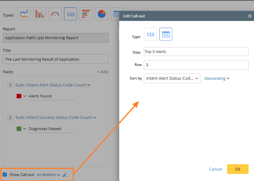 Check the Show Call-out option in the Edit Widget window to display the call-out in the Dashboard pane. Click on the pencil icon to define the call-out.