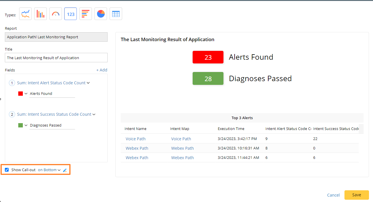 Select the Metric Chart as the format in the Edit Call-out window to define a Metric Call-out. There are two key elements for Metric Call-out: