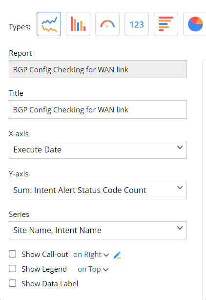 - Select the Series as Site Name and Intent Name and the chart title to BGP Config Check Alerts by Date.