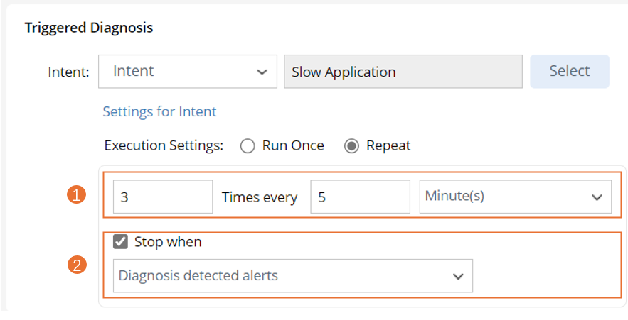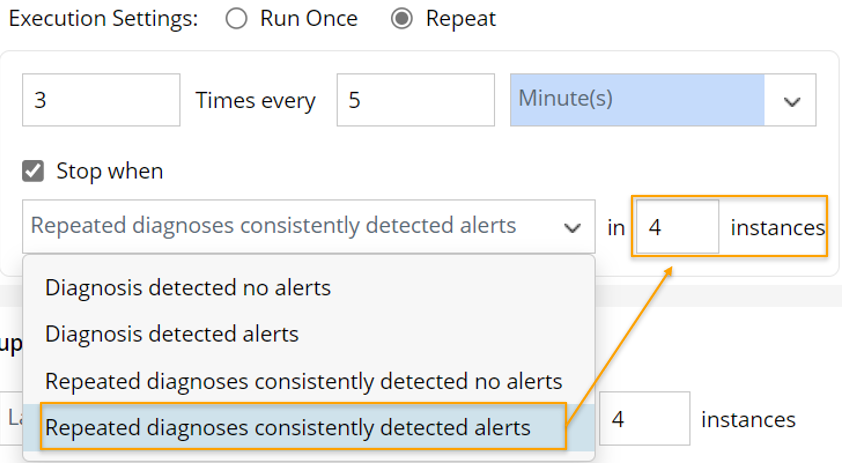 - Repeat: One Diagnosis can run for a fixed number of times at specified intervals by Execution Settings. You can set to run triggered diagnosis to check the issue a few times, making sure there is no transient problem.