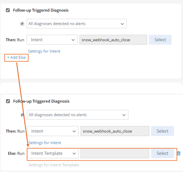 Example: Suppose the intent "Check Slow Application" is run several times and there is no alert, you can define follow-up triggered diagnosis to close ServiceNow ticket that triggered the automation. When there is alert generated, run the intent template "Auto Remediation" to remedy this issue.