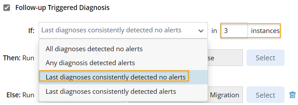 - Last diagnoses consistently detected no alerts: Trigger to run follow-up diagnosis if the last n main triggered diagnosis instances have no alerts. If Last diagnoses consistently detected no alerts is selected, you can set the number of instances of the diagnoses, and the range of this number is 1-9.