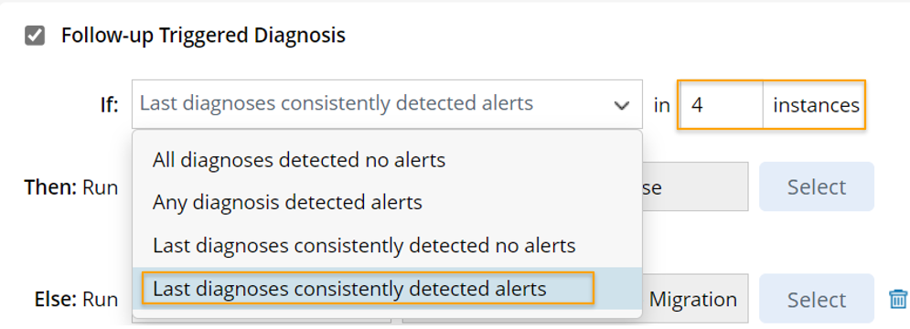 - Last diagnoses consistently detected alerts: Trigger to run follow-up diagnosis if the last n main triggered diagnosis instances have alerts. If Last diagnoses consistently detected alerts is selected, you can set the number of instances of the diagnoses, and the range of this number is 1-9.
