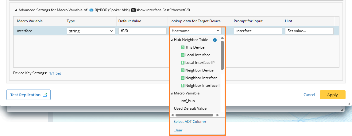 For example, the hub and spoke devices both use the command show interface $intf to get corresponding interfaces. You can select the neighbor_interface column for the spoke macro variable and select local_interface as the mapping column for the hub macro variable to find the relationship between them.