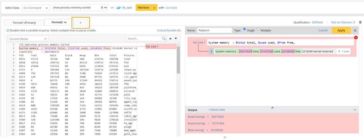You can add more formats for the parser (click the + icon in the format tab bar). e.g., define the same variables for a Cisco IOS Switch device. The anchor is System memory: total, used, free, which is different from that in Format1.