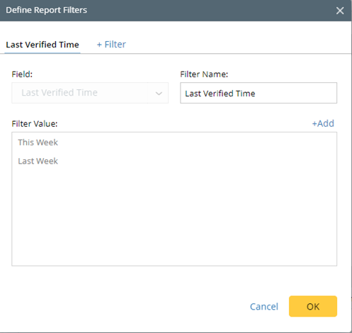 - Filter Value – This defines the options in the drop-down list for Report Filters. Click on +Add to add Filter Values. You can add up to ten Filter Values for each filter.