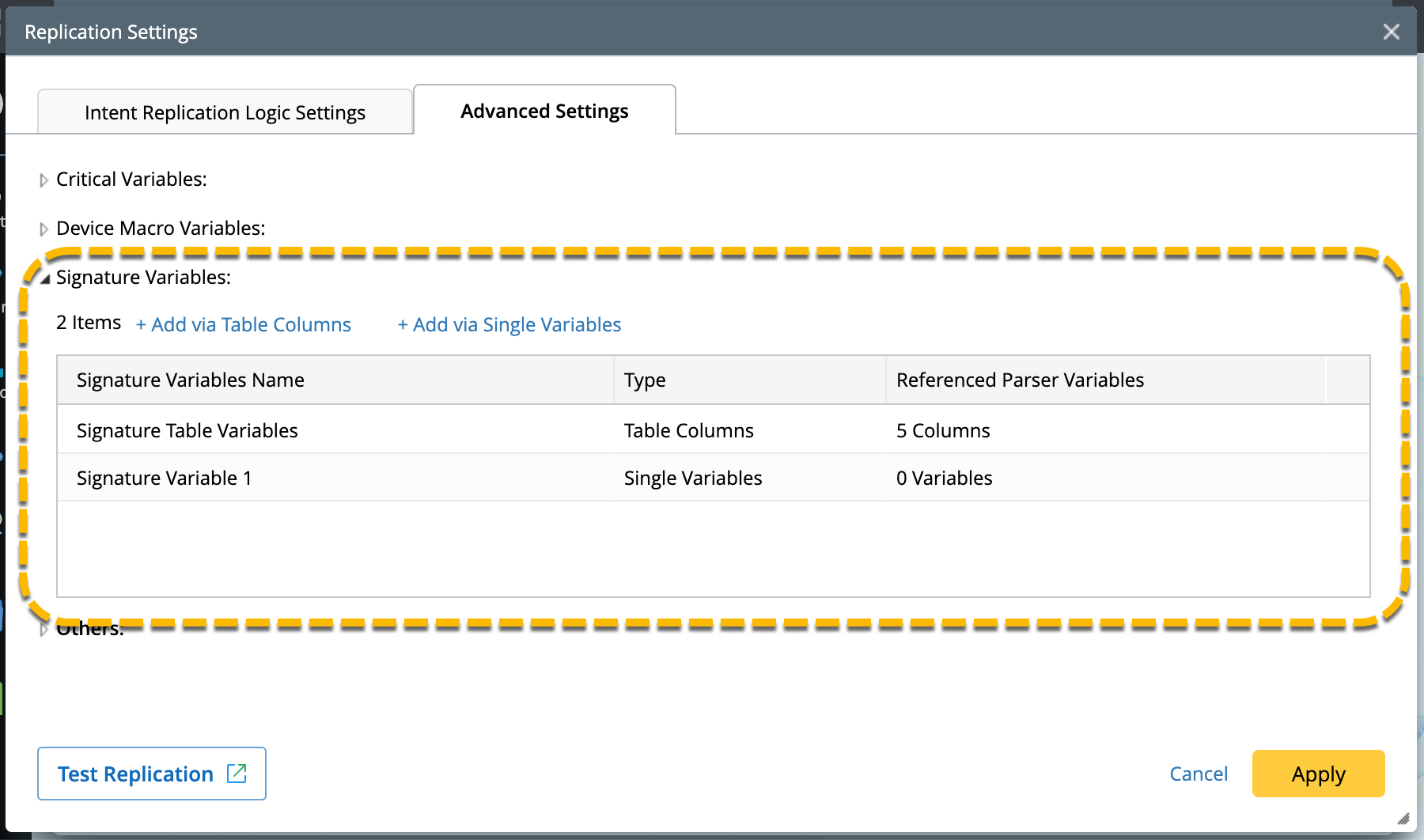 Signature Variable Manager is displayed on the Advanced Settings tab in the Replication Settings dialog.