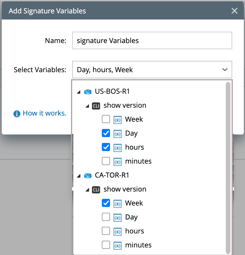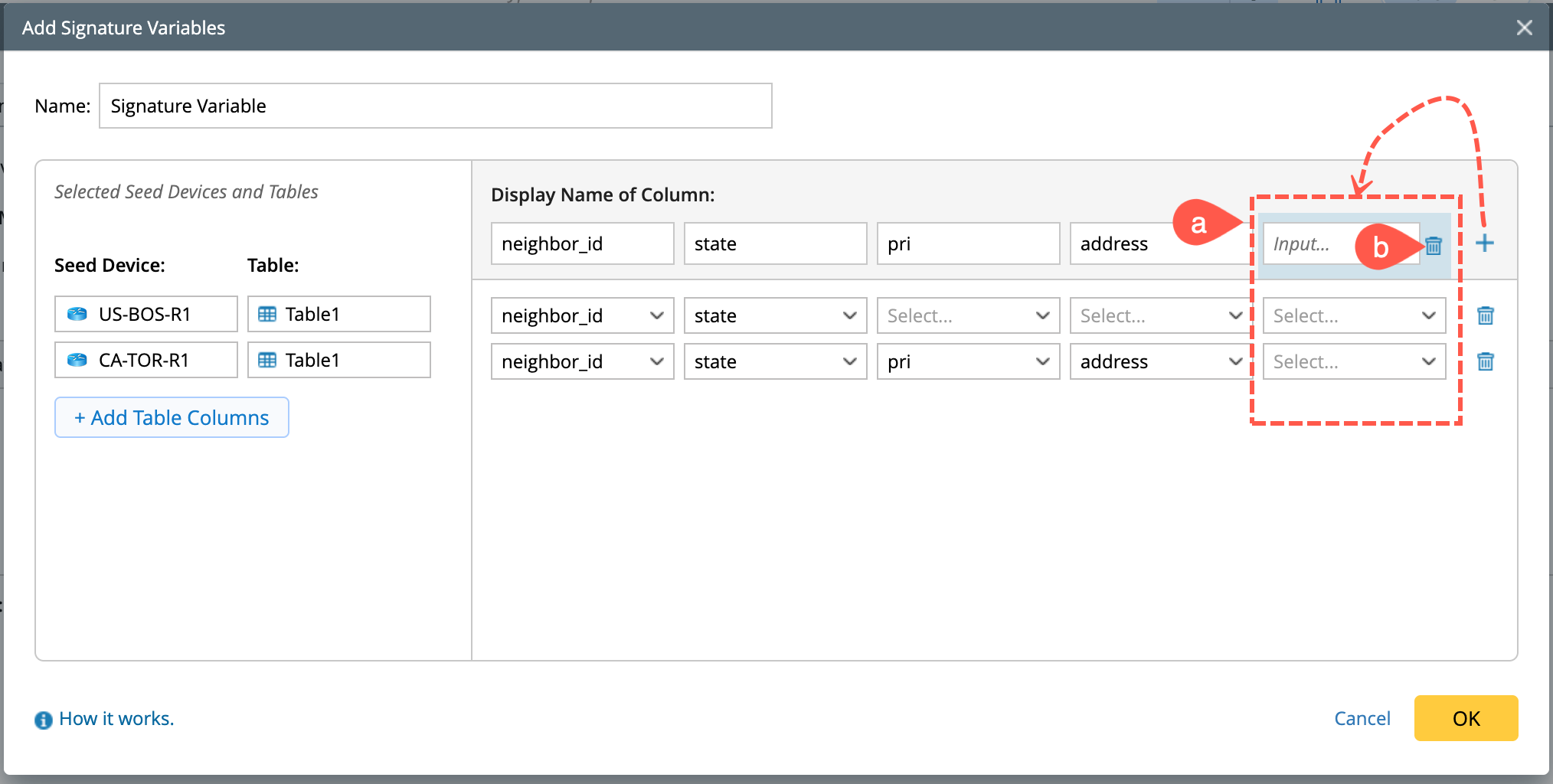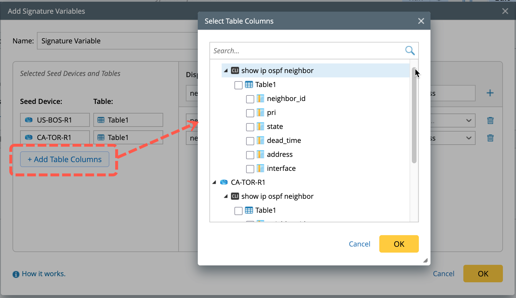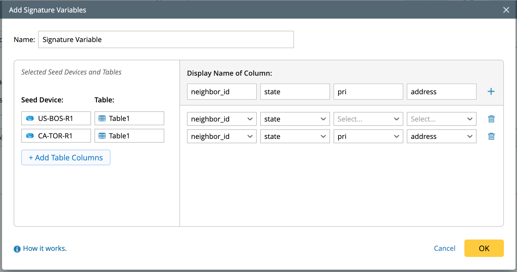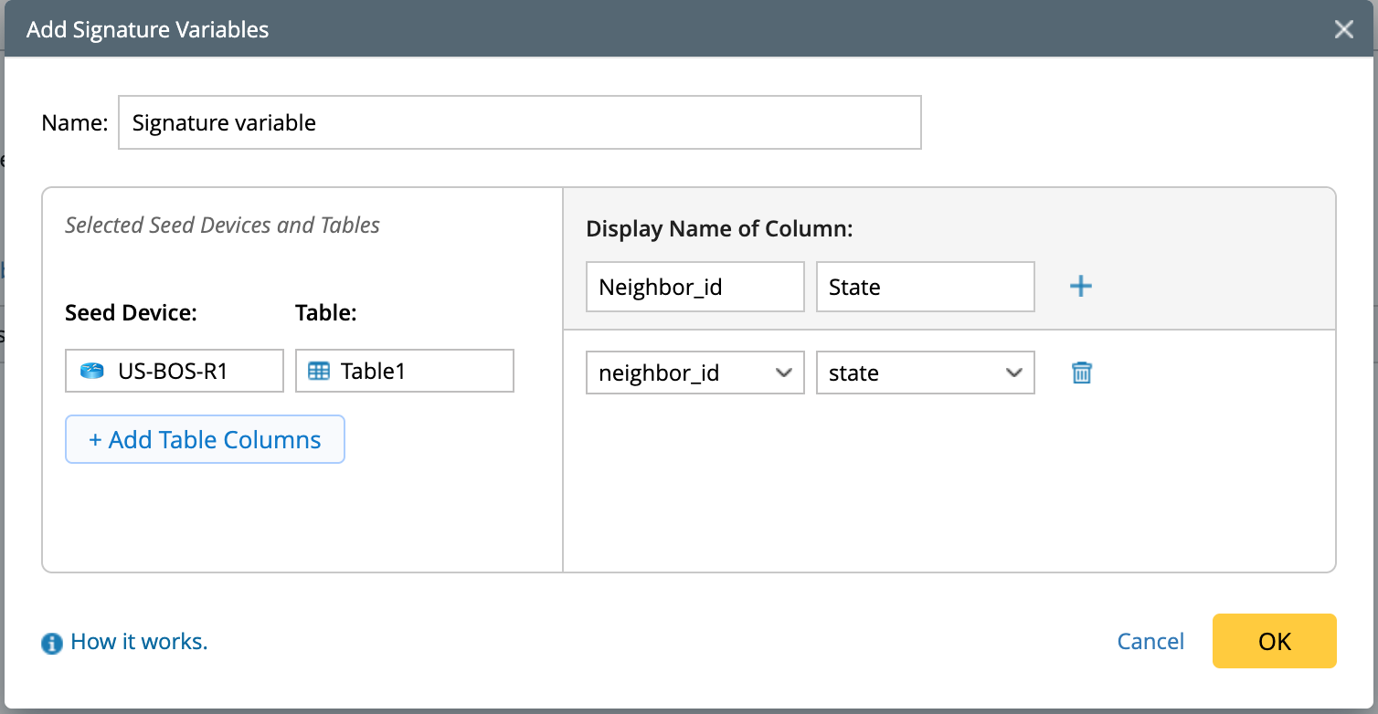 Default Table Selection Logic: When multiple device tables are selected, the system automatically uses the table with the most selected columns as the base. Each column in this table is used to generate the corresponding signature variable values.